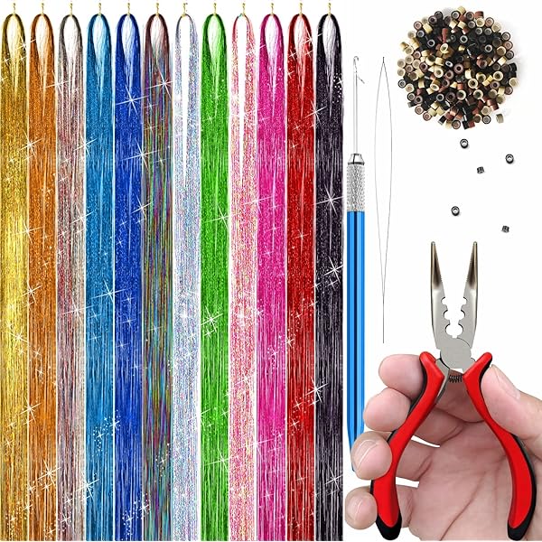 Amazon Com Hair Tinsel Kit Tinsel Hair Extensions 14 Colors Glittery Fairy Tensile Hair Heat Risitant With Tools For Women Girls Plier Pulling Needle 100 Dark Beads 100 Blonde Beads Beauty Personal Care